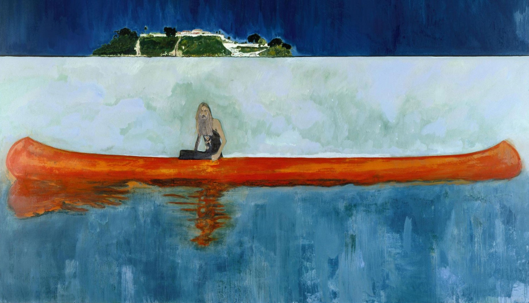 JMG : As we descend into the basement, we come face to face with a bearded figure. He's looking at us from the side, sitting on a canoe. This painting, entitled One Hundred Years Ago, is by Peter Doig, one of the world's greatest contemporary painters. Many of the works in the exhibition play on the notion of time. This unfathomable, alien-looking figure floats in the middle of a surprisingly calm sea. A kind of confusion sets in. The scene resembles something familiar, but also exudes a kind of disquieting strangeness, to use Freud's term. That's the magic of this painting.