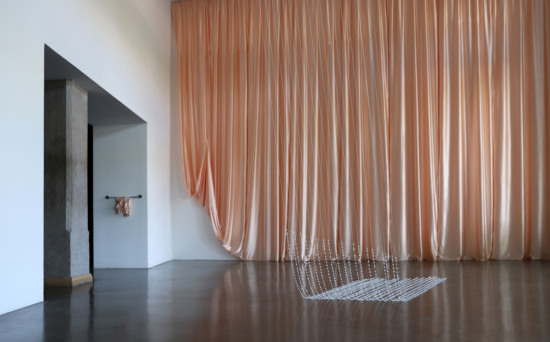 Il est en effet question de perception dans cette installation. Le coin soulevé de ce grand rideau ne révèle rien d’autre derrière que la présence d’un mur. La paire de gants suspendue est faite dans le même tissu que celui du rideau. L’un est cousu avec l’endroit du tissu, l’autre avec l’envers, comme à imaginer un retournement à l’infini, sans que jamais la paire ne vienne à coïncider. Placés là, les gants suggèrent le mouvement de soulèvement du rideau esquissé, le geste d’aller voir ce qu’il y a de l’autre côté. Mais derrière, il n’y a rien.