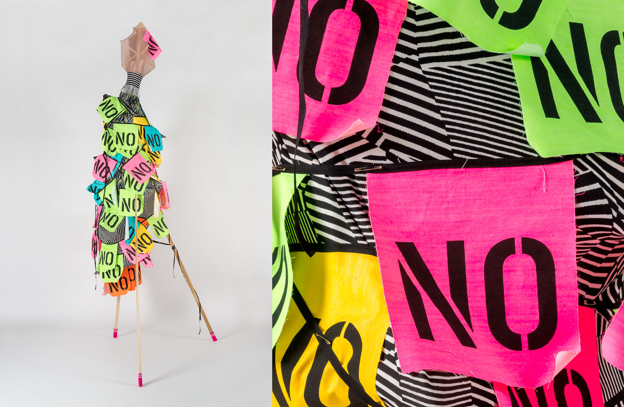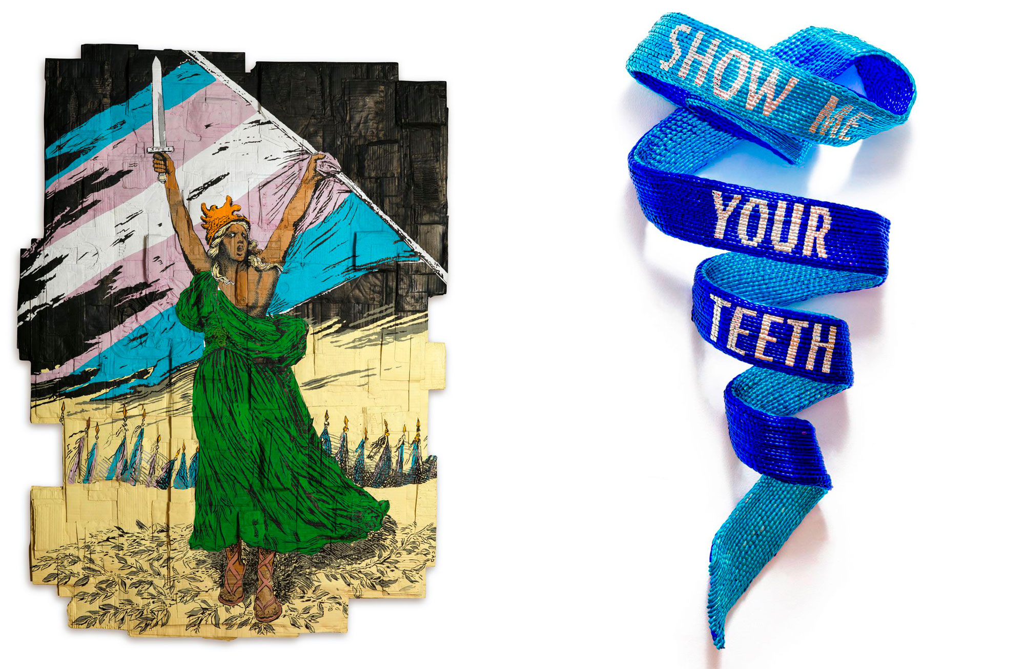 Among the works featured in the group exhibition Engagées at the Villa Datris Foundation, two explore the boundaries between art and textile craft, as well as their activist potential. Austrian artist Katharina Cibulka gives shape to feminist slogans in SOLANGE (As long as) by embroidering impactful phrases onto tulle stretched across construction site tarpaulins.