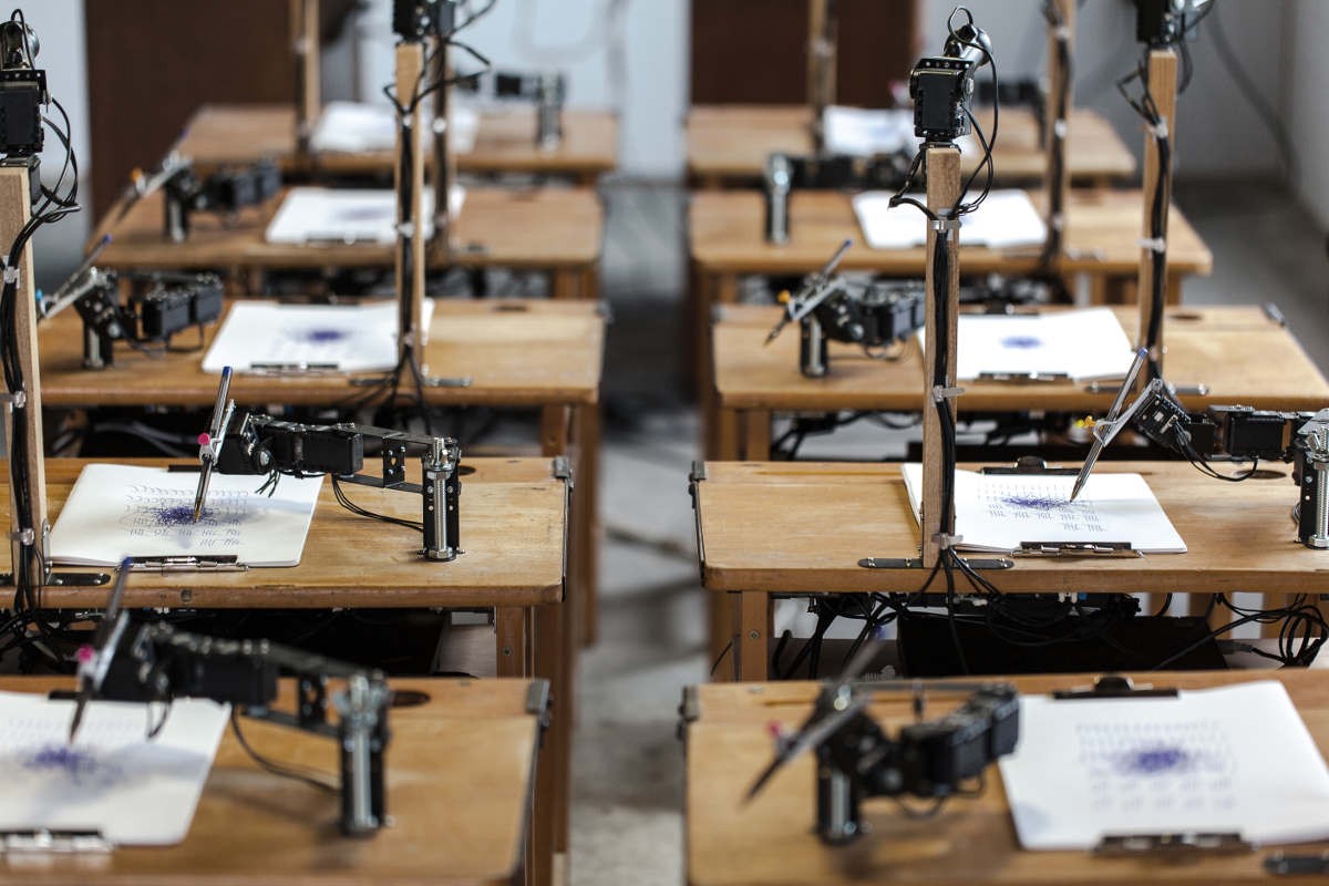Twenty pupils and their teacher, all represented by autonomous robots: a performance installation that questions the standardisation of behaviour.